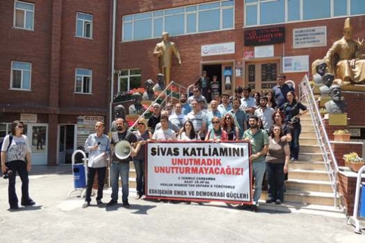 Eskişehir Emek ve Demokrasi Güçleri Sivas Katliamının 21. Yıldönümünde Eskişehir Cemevi’nde yapılan basın açıklamasında, 2 Temmuz 1993’de Sivas Madımak Oteli’ndeki katliam ateşinin, yürekleri yakmayı sürdürdüğü vurgulandı.
