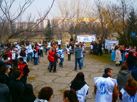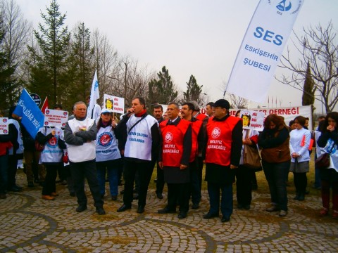 G(ö)REVE çıkan arkadaşlarımızla sabah erken saatlerde, Hamamyolu Saatli kulede toplandık. Sendikamız SES, Tabip Odası ve Türk Sağlık-Sen olarak saat: 09.oo’da yaklaşık 200 kişilik kortejimiz sloganlar eşliğinde Sağlık Md.lüğü önüne yürüyüşe geçti. Burada yapılan açıklamaların ardından, otobüs ve araçlarla ESOGÜ Tıp Fakültesi hastanesine gidildi. Burada Asistan hekimler, Tıp öğrencilerininde katıldığı yaklaşık 3 saat boyunca forum düzenlendi. Forumda isteyen herkese söz hakkı verildi. Öğretim görevlisi, Asistan Hekimler, Hemşire, Taşeron sağlık emekçileri yaşanan sıkıntılar ve talepleri ile ilgili konuşmalar yaptılar. Coşku içerisinde çekilen halayların ardından etkinliğimiz sona erdi. G(ö)REVİMİZE destek veren Sağlık Emekçilerine, Emek/Meslek örgütleri temsilcilerine sonsuz teşekkürler…