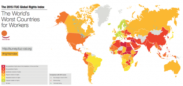 ITUC Küresel İşçi Hakları Endeksi, 141 ülkeyi, hukuksal ve pratik olarak işçi haklarının en çok korunduğu ülkeden en az korunduğu ülkeye doğru sıraladı.