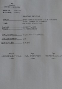 Manisa’da aile hekimliğinde görev yapan ve nöbetlere gitmedikleri için verilen ihtar puanlarını yargıya taşıyan üyelerimiz hemşire Banu Yılmaz ve aile hekimi Dr.Mehmet Ali Kütahyalı’nın davaları sonuçlandı. Manisa 2. İdare Mahkemesinde görülen davalarda üyelerimiz haklı bulundu ve dava konusu ihtar puanları iptal edildi. Davalarla ilgili gerekçeli kararlar açıklandığında internet sitemizden paylaşılacaktır. Mahkeme sonucunu gösteren belgeler aşağıda paylaşılmaktadır.