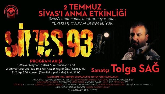 Sivas’ı Unutmadık Unutturmayacağız… 2 Temmuz 2016 Cumartesi günü; saat: 12:00 Vilayet Meydanı Çelenk Sunumu, saat:17:00 Anma Yürüyüşü (Toplanma Yeri Adalar Migros) saat: 21:00 Tolga Sağ konseri (Cem Evi toprak saha)