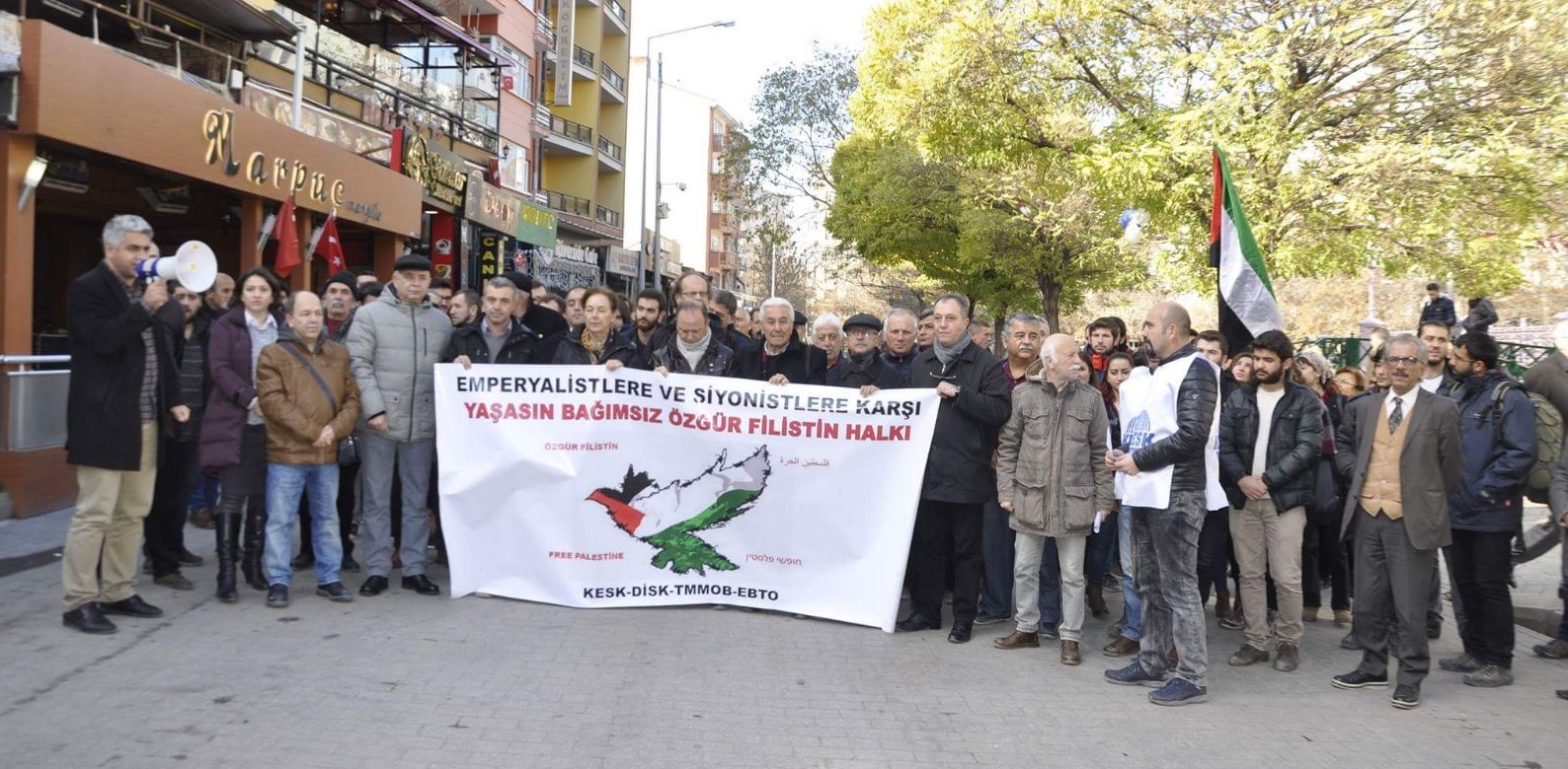 Bizler KESK,DİSK,TMMOB ve EBTO olarak aslında Filistin halkının gerçek dostlarının kimler olduğunu bilmekteyiz. Filistin halkının bugünlerde yaşadığı dram hangi ülkede olursa olsun iç politika malzemesi yapılmamalıdır. Nerenin başkent olacağına ABD ya da İsrail politikacıları değil orada yaşayan halklar karar vermelidir. Diyoruz ki; provokasyon derhal durdurulmalı, Filistin halkının meşru talepleri kabul edilmeli, Filistin ve İsrail halklarının bir arada ve barış içinde yaşamaları için gerekli siyasal adımlar atılmalıdır.