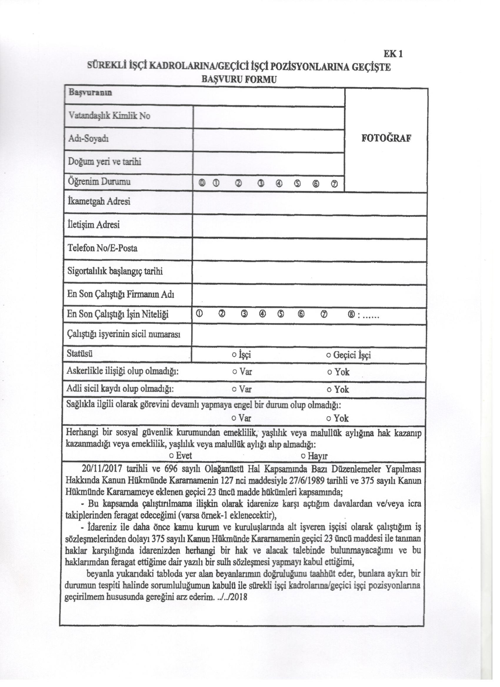 Çalışma ve Sosyal Güvenlik Bakanlığı’nın 1 Ocak 2018 tarihinde Resmi Gazetede yayınlanan tebliği gereği başvuruların tebliğin ekinde yer alan başvuru formu ve istenen evraklarla yapılması zorunlu. Dolayısıyla kurumların hazırladığı farklı başvuru formları kullanılmamalı. Tebliğin ekindeki başvuru formu kullanılmalı. Merkezi idarelerde kadroya geçecek olan işçiler, tebliğ ek-1’deki başvuru formunu eksiksiz doldurmalı. Yerel yönetimlerde şirketlere geçecek olan işçiler tebliğ ek-2’deki başvuru formunu eksiksiz doldurmalı.