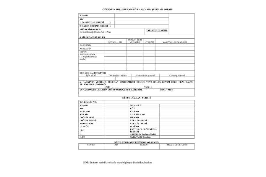 Tüm işçilerin vereceği güvenlik soruşturması ve arşiv araştırması formu.