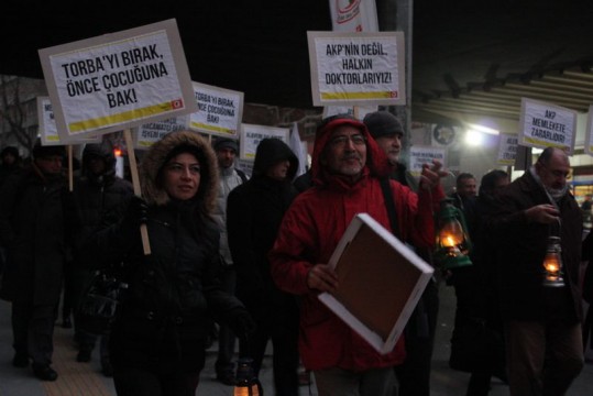 Hekimler daha sonra fener alayı oluşturdu ve “Hırsız var!”, “Hırsızlara değil, sağlığa bütçe” sloganlarıyla Sağlık Bakanlığı’na yürüdü. “Mesele ‘Tam Gün’ Meselesi Değil, Mesele Hekim Emeği Ve Hasta Sömürüsü Meselesi – Kırk Madde Yeter Üstü Kalsın” yazılı dev bir pankart taşıyan hekimler, pankartı Sağlık Bakanlığı’nın demir parmaklıklarına astı.