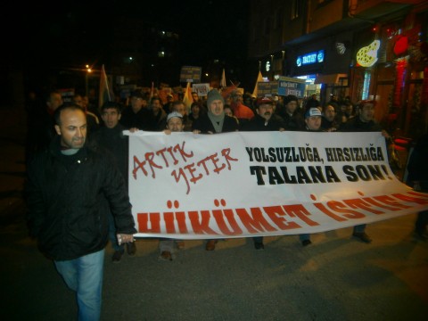 Eskişehir Emek ve Demokrasi güçleri AKP’nin yolsuzluk ve rüşvet düzenine karşı alanlara indi. KESK, DİSK, TMMOB ve TTB’nin çağrısıyla 29 Aralık Pazar günü saat:17.00’de Üniversite caddesinde toplanan yüzlerce emekçi, “Yolsuzluğa, Hırsızlığa, Talana Son; Hükümet İstifa” yazılı pankart eşliğinde kortej oluşturarak yürüyüşe geçti. Yolda halkın da katılımıyla artan kalabalık, “Hükümet İstifa; Paralar Kutuda Hırsızlar İktidarda; Diren Berkin Tayyip Gidiyor; Bu Pisliği Ancak Halk Temizler; Kurtuluş Yok Tek Başına , Ya Hep Beraber Ya Hiç Birimiz; Bu Daha Başlangıç Mücadeleye Devam; Hırsızlar Mezara Halk İktidara; Gün Gelecek, Devran Dönecek, AKP Halka Hesap Verecek” sloganları eşliğinde Adalar Migros önüne kadar yürüdü. Burada Eskişehir Emek ve Demokrasi Güçleri adına Kristal İş Şube Başkanı Erdal AKYAZI trafından bir basın açıklaması yapıldı. Erdal AKYAZI yaptığı açıklamada şunları belirtti: “On bir yıldır iktidarda bulunan AKP ve gizli ortağı Gülen cemaati arasındaki ittifak çatırdadı. Etrafa rüşvet, yolsuzluk, ihtilas, irtikap yayıldı. Ağızlarını her açtıklarında ‘Allah, Peygamber, din, iman’ sözleri dökülenlerin nasıl da dünya malına tamah ettikleri, nasıl da lüks ve şaşaa düşkünü oldukları, nasıl da paraya taptıkları bir bir ortaya dökülüyor. Her iki tarafın birbiriyle ilgili iddialarını birer itiraf olarak kabul ediyoruz. Çünkü ikisinin de masum olmadığını, suç ortağı olduklarını biliyoruz. Yolsuzluk, yoksulluk, zulüm düzeninin sorumlusu olduklarını biliyoruz. Emek ve Demokrasi Güçleri olarak eşitlik, özgürlük, demokrasi ve emekten yana bütün örgütleri, bütün kurumları, bütün inisiyatif, bütün dayanışma, bütün forumları tek bir istisna bile bırakmadan bütün yurttaşlarımızı yan yana gelip, omuz omuza vermeye, yolsuzluğa, hırsızlığa, talana karşı ülkenin her bir tarafında hep birlikte mücadele etmeye çağırıyoruz.”